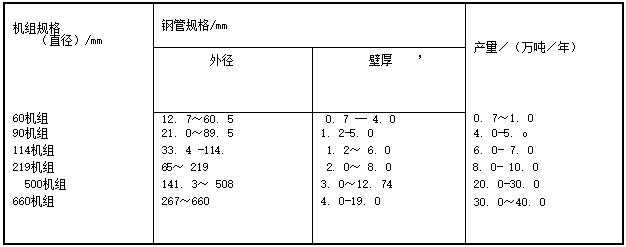 高頻直縫連續(xù)電焊管機(jī)組目前可生產(chǎn)φ5-660×0.5-15mm的水煤氣管道用管、鍋爐管、油管、石油鉆采管和機(jī)械工業(yè)用等中小口徑管。當(dāng)采用排輥成型法時(shí),產(chǎn)品規(guī)格可擴(kuò)大φ400-122×6.4-22. 2mm。直縫電焊管以碳素鋼、低合金鋼或合金鋼熱軋或冷軋帶卷為坯料,其規(guī)格由焊接鋼管的規(guī)格需求決定。根據(jù)市場(chǎng)需求和原料條件確定。部分中小直徑直縫電焊鋼管機(jī)組的設(shè)計(jì)規(guī)模,產(chǎn)品方案如下表所示。