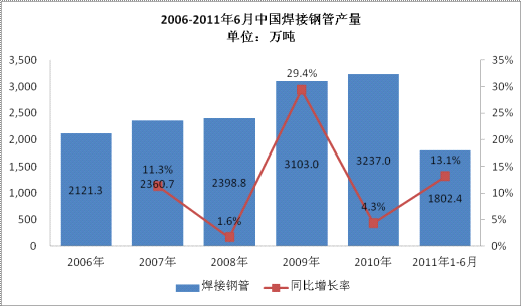 2010年,我國焊接鋼管產(chǎn)量達到3237萬噸,比2009年增長4.3%;2011年上半年,我國焊接鋼管產(chǎn)量累計達到1802.4萬噸,比上年同期增長13.1%。